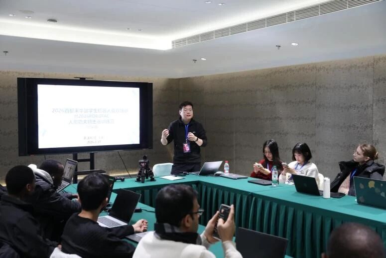 技术培训环节中,来自宇树科技的资深讲师带来了系列课程,内容涵盖人形机器人操作、强化学习基本原理、人形机器人行走控制的仿真训练等关键技术模块,帮助参赛队伍全面理解大型人形机器人的控制逻辑与开发路径;同期开展的小型组课程则由赛曙科技赛事高级讲师主讲,重点围绕人形机器人结构认知、舵机伺服控制原理、开发平台使用方法等内容展开,强化参赛队伍对小型人形机器人硬件与动作控制的理解。