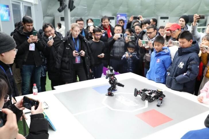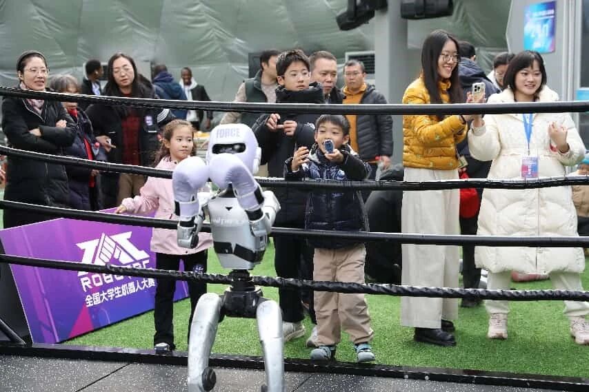 在展示交流阶段,开展大型组与小型组人形功夫搏击赛表演活动,集中展示参赛机器人在对抗动作、稳定性与控制策略等方面的综合表现,并设置了嘉宾参观与互动环节,组织行业嘉宾与青少年观众走进机器人展区,与人形机器人进行近距离、沉浸式互动,增强了活动的趣味性与参与感,为机器人教育与科普实践开辟了新的路径。
